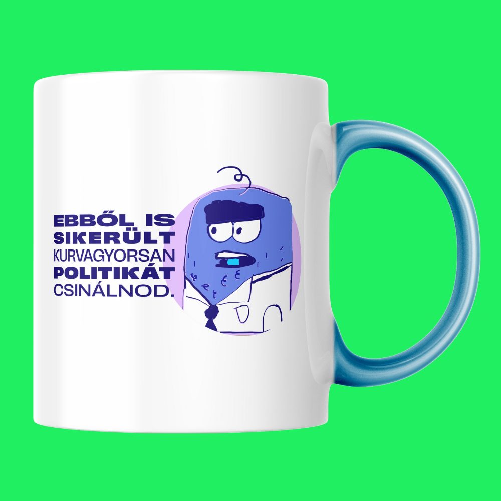 Benis bögre idézettel, világoskék füllel, JS bevonattal.