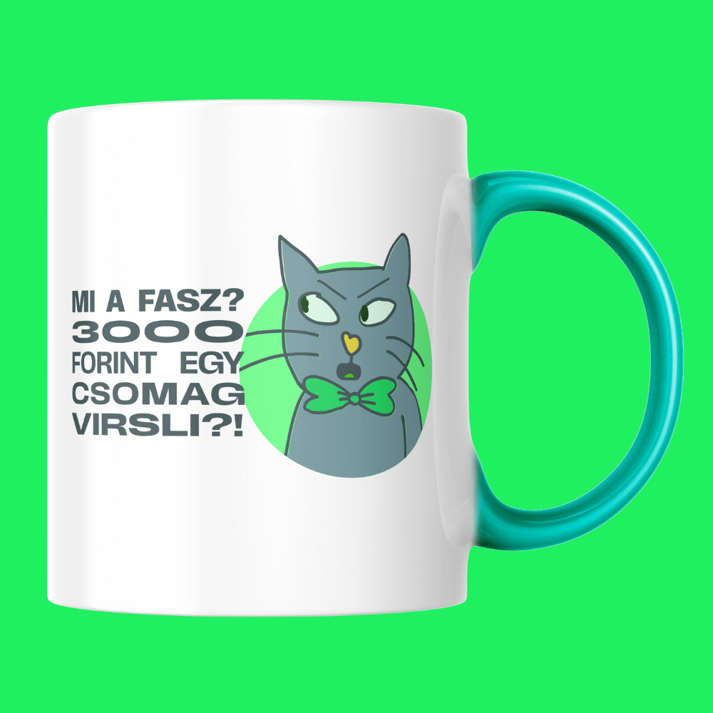 Nyakkendős Macska bögre idézettel, türkiz füllel, JS bevonattal.